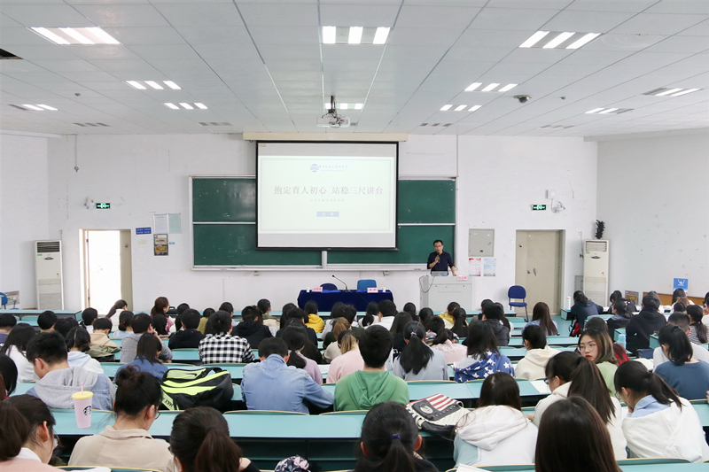 王平老师以“抱定育人之心,站稳三尺讲台”为主题,以自己的职业生涯故事作为切入点,讲述了从求学到育人的宝贵经历,强调了作为一名教师的责任心和使命感。此外,王平老师还对教师职业素养进行了概括,从内功、技能、共情、本心四个方面进行重点分析,他还指出“学无止境”的的重要性。最后,他用一首诗歌《新教育之梦》赞颂了教师这份伟大职业,并祝福在座的同学将来都能成为一名幸福的老师,谆谆教诲,满满祝福赢得了在座同学的热烈掌声。一名学生表示:“王老师用深入浅出的语言为我们解释了教书育人的道理,我们会不断努力,争取成为像王老师一样的受人爱戴的好老师。”