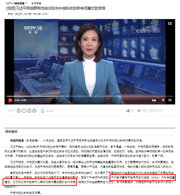 11月26日,国家主席习近平同俄罗斯总统普京分别向中俄科技创新年闭幕式致贺信。两位领导人在贺信中对两国千余项科技创新合作交流活动以及取得的丰硕合作成果进行了肯定,俄方领导人普京特别指出中方参与重离子超导同步加速器(NICA)大科学装置建设为其中最主要的合作成果之一。