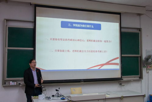 接下来,黄文华教授和毛俊雯教授分别作动员讲话。黄文华重点结合科学教育专业就业方向和专业基础,引导同学们要有危机意识,把考研作为自己的一个选择,并鼓励同学们对考研要有信心。毛俊雯教授介绍了考研的意义包括提高就业竞争力、开阔视野、到想去的地方学习工作以及实现学术梦想;分析如何从选学校、选专业、专业课复习等方面做好考研规划,最后还介绍了历年优秀毕业生代表,鼓励同学们向学长学姐学习,树立远大志向。