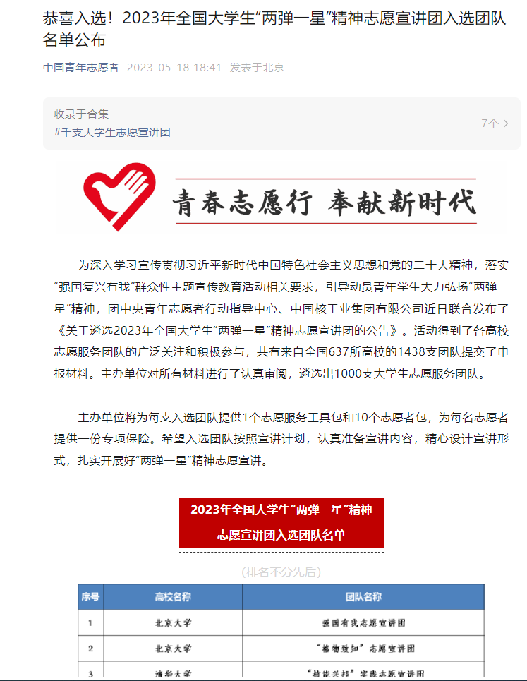 近日,为深入学习贯彻习近平新时代中国特色社会主义思想和党的二十大精神,落实“强国复兴有我”群众性主题宣传教育活动相关要求,引导动员青年学生大力弘扬“两弹一星”精神,团中央青年志愿者行动指导中心、中国核工业集团有限公司联合发布了《关于遴选2023年全国大学生“两弹一星”精神志愿宣讲团的公告》。在参与该活动的全国637所高校的1438支团队中,我院“数”说科学家精神志愿宣讲团成功入选2023年全国大学生“两弹一星”精神志愿宣讲团队名单。