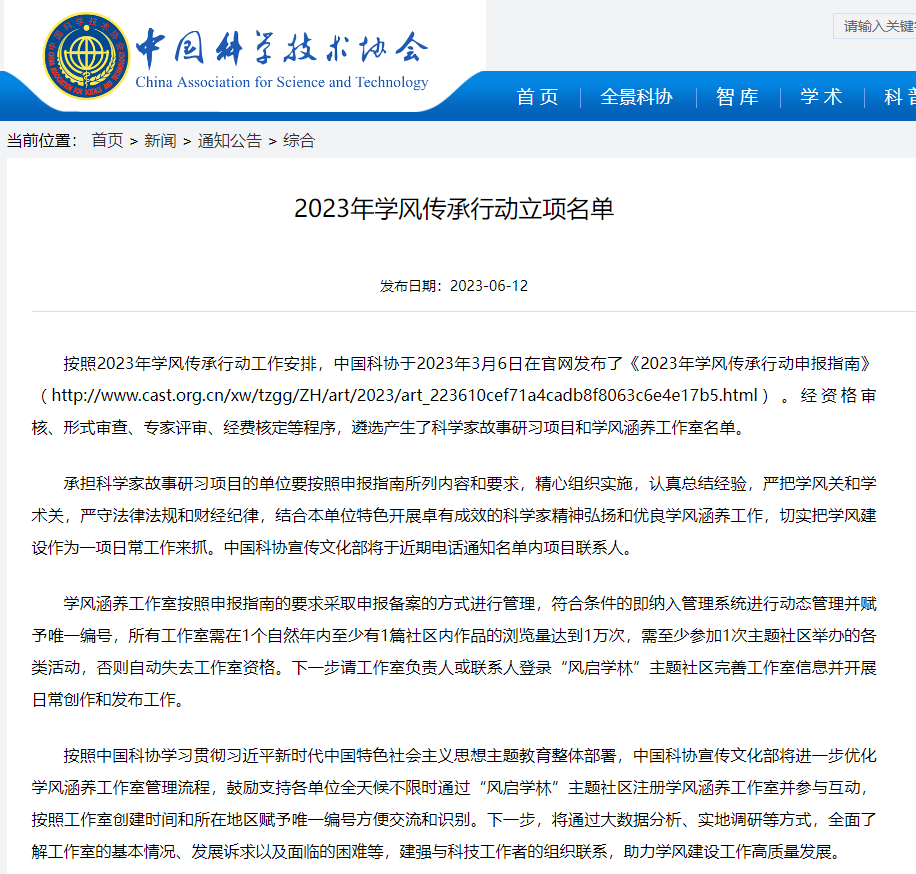 今年3月,为弘扬科学家精神、涵养优良学风,中国科学技术协会发布了《2023年学风传承行动申报指南》,面向全国高等院校、科研机构及企事业单位开展学风建设资助项目。近日,科协公布了2023年度学风传承行动项目立项名单。我院申报的“星闪耀“学风涵养工作室,经资格审核、形式审查、专家评审等程序,获批成为2023年度学风涵养工作室。