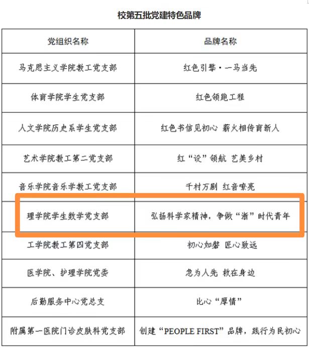 为了强化党建引领,激发基层创新活力,学校近期举行了第五批党建特色品牌评选会。会上,18位参评党组织负责人围绕品牌内涵、特色做法和亮点成效作了汇报。日前,评选结果已经揭晓,我院学生数学党支部申报的《弘扬科学家精神争做“浙”时代青年》成功入选校第五批党建特色品牌。