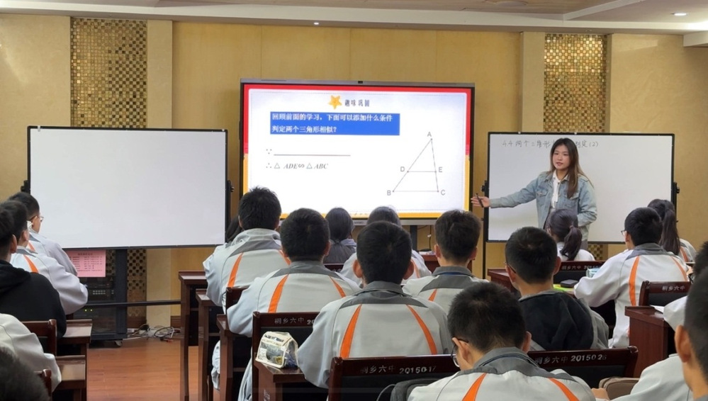 桐乡六中教育集团实验中学的李立芬和王倩老师也分别开展了同课题的研讨课。李立芬老师从“四个一”模块进行了课堂展现,将数形结合、类比、一般到特殊的数学思想贯穿整个教学过程,知识脉络清晰,课堂气氛活跃,达到了很好的教学效果;王倩老师课堂始终本着以学生为中心的教学理念,学生动手实操,课堂小组讨论,引导学生自己得到 “构相似,证全等”的课堂教学核心点。