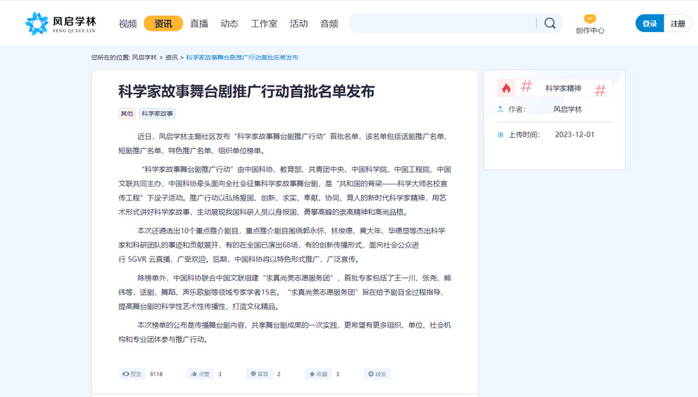 “科学家故事舞台剧推广行动”由中国科协、教育部、共青团中央、中国科学院、中国工程院、中国文联共同主办,中国科协牵头面向全社会征集科学家故事舞台剧,是“共和国的脊梁——科学大师名校宣传工程”下设子活动。推广行动以弘扬爱国、创新、求实、奉献、协同、育人的新时代科学家精神,用艺术形式讲好科学家故事,生动展现我国科研人员以身报国、勇攀高峰的崇高精神和高尚品格。