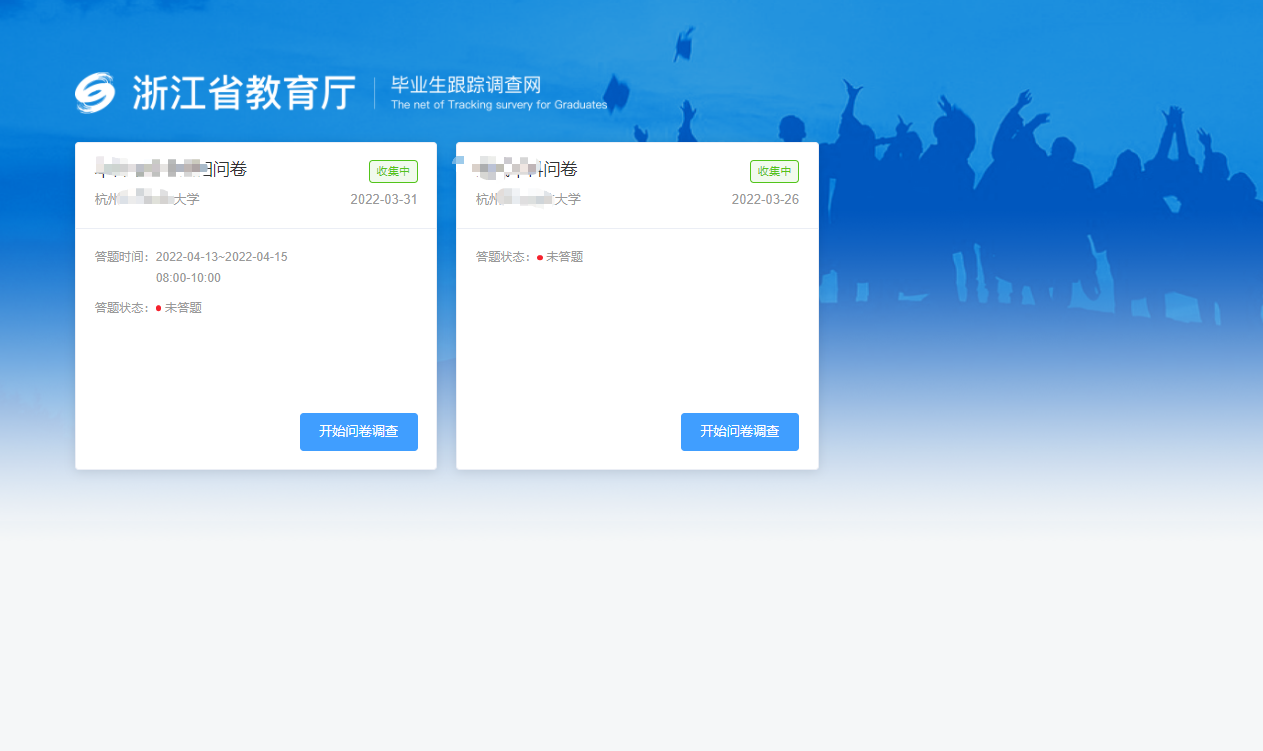 验证通过后,系统自动进入问卷列表页面,毕业生需对收集中的问卷进行答卷,非收集中状态的问卷不可答卷。如图: