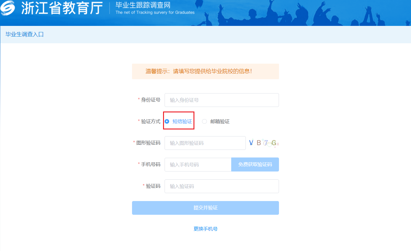 输入毕业生上报给毕业学校的身份证号、手机号码,填写图形验证码,点击【免费获取验证码】,输入验证码后,点击【提交并验证】,验证通过后进入答题页面。