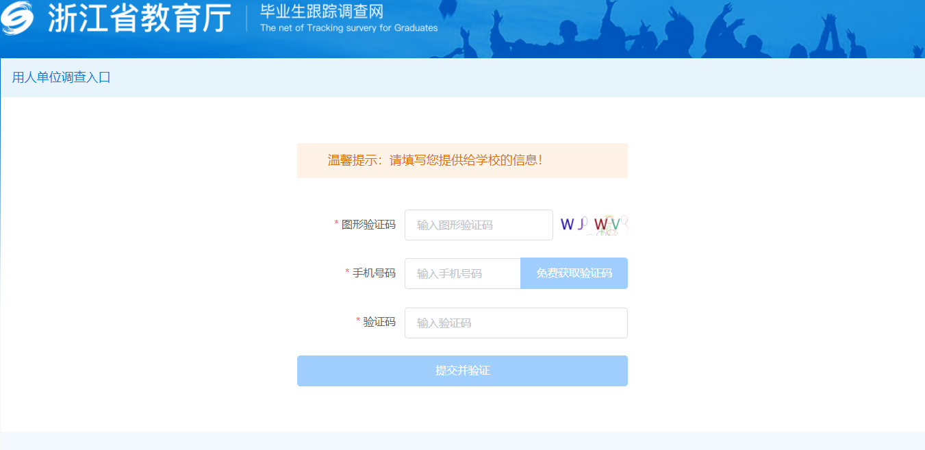 输入用人单位上报给高校的手机号码,填写图形验证码,点击【免费获取验证码】,输入验证码后,点击【提交并验证】,验证通过后进入答题页面。