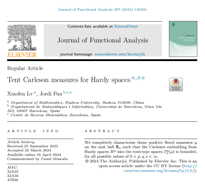 近日,我院多复变研究团队成员吕小芬教授(第一作者)巴塞罗那大学Pau Jordi教授合作在分析学领域国际顶级学术期刊《Journal of Functional Analysis》发表了题为“Tent Carleson measures for Hardy spaces”的学术论文。该文利用调和分析的方法,彻底解决了多复变全纯Hardy空间到帐篷空间上嵌入算子的有界性问题,为进一步研究这类函数空间上相关算子的特性提供了新的研究方法。该研究工作得到了国家自然科学基金面上项目的资助湖州师范学院为第一完成单位。
