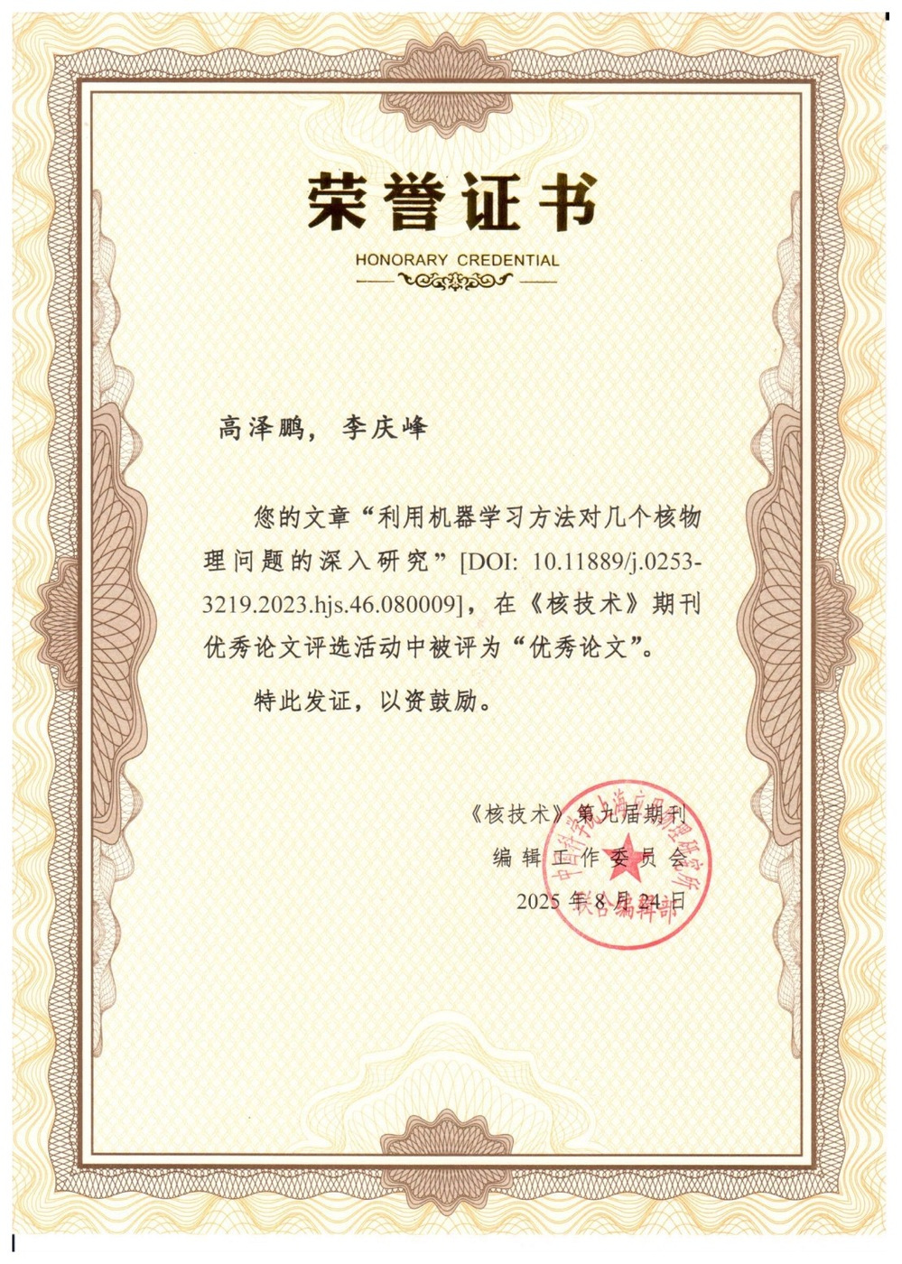 由李庆峰教授担任通讯作者、我校联合培养的硕士生高泽鹏(现为中山大学在读博士生)为第一作者的论文《利用机器学习方法对几个核物理问题的深入研究》,荣获2024年度《核技术》“优秀论文”称号。