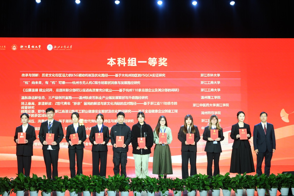 11月7日至8日,浙江省“民生民意杯”第十四届大学生统计调查方案设计大赛在浙江农林大学圆满结束。在本届大赛中,我校代表队凭借出色的表现,最终斩获一等奖3项、二等奖1项、三等奖4项。本届大赛由浙江省教育厅、浙江省统计局联合主办,共有来自全省80所高校的659支队伍参赛。经过激烈的角逐,最终155支队伍进入答辩环节。