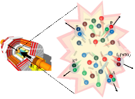 图:CMS探测器与高能重离子碰撞中多个夸克合成为强子的过程示意图