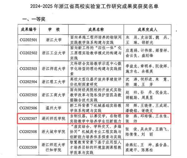 近日,2024-2025年浙江省高校实验室工作研究成果奖获奖名单正式公布。我院徐燕老师主持完成的《自制仪器,以赛促学,在物理实验教学中培养学生创新能力》成果荣获一等奖。