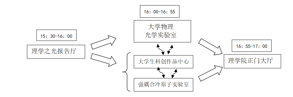 16:00-16:55 | 光学实验室(25分钟1批) 大学生科创作品展示中心(15分钟1批) 强耦合冷原子实验室(15分钟1批) | 实验室介绍与实验讲解,学生体验指导 | 徐燕 呼格吉乐 李可 | 黄文华,张天声负责路线引导, 学生分4个组进行参观轮换 首批光学实验室1,2组,科创作品展示中心3组,冷原子实验室4组 |