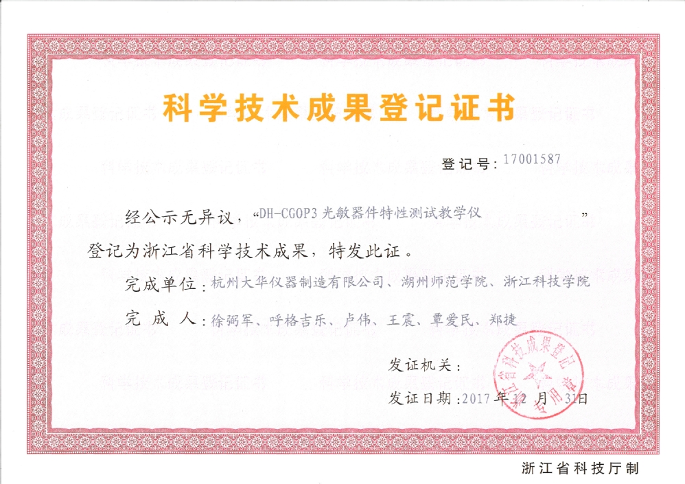 浙江省科学技术成果登记:DH-CGOP3光敏器件特性测试教学仪