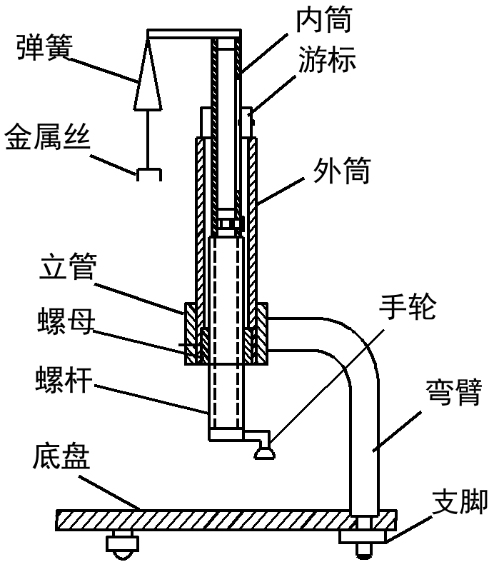 底盘上表面边缘处垂直安装弯臂,弯臂的上部水平部分垂直于底盘的轴线方向,并在弯臂水平部分的端部固定安装立管;其内孔轴线与底盘的轴线重合,在立管的内圆柱孔中向上垂直安装焦利氏秤的外筒,将外筒底部嵌入螺母并固定,螺母内部旋入螺杆,通过螺杆在螺母中旋转,带动内筒上下平稳移动.螺杆与螺母均采用国家标准的精密滚珠丝杠,可以消除螺纹间隙,提高测量精度。