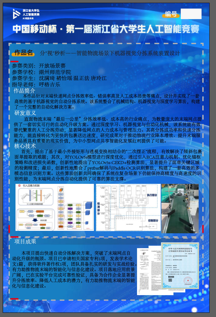该作品聚焦智能物流末端分拣痛点,创新采用优化算法与低成本平台相结合的设计思路。通过面单提取摆正算法高效应对复杂场景干扰,改进 YOLO v5s 模型保障检测精度,适配基层网点实际需求的低成本方案显著降低应用门槛。作品兼具理论创新与实践价值,已申请 2 项发明专利(进入实审阶段),发表相关学术论文 1 篇,获软件著作权 1 项。目前,系统样机已部署于某交通技师学院校园驿站,深度参与日常快件分拣工作,充分验证了技术方案的可行性与实用价值。